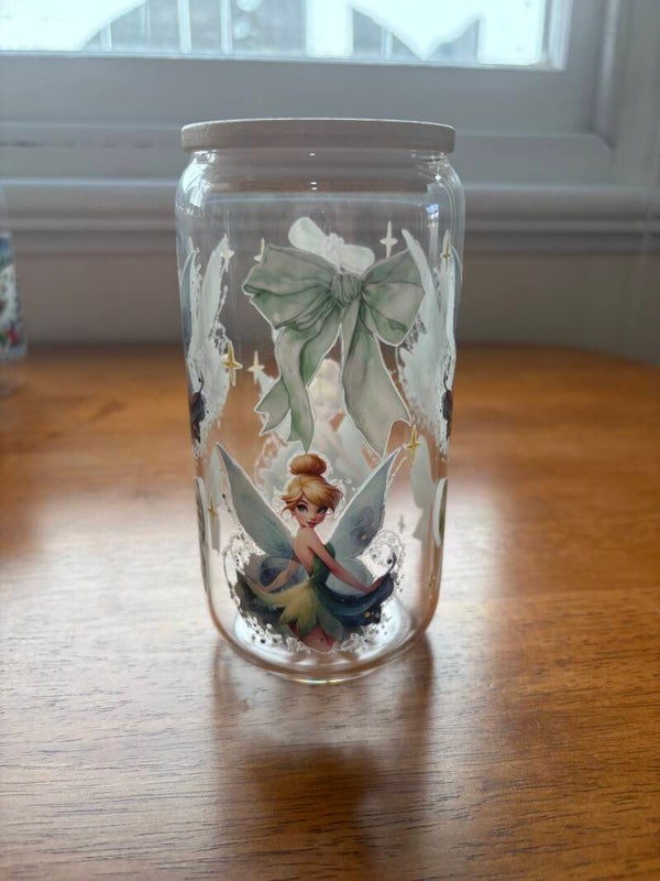 We hope you like our tinker bell glass tumblr 16oz. Comes with a lid and straw.